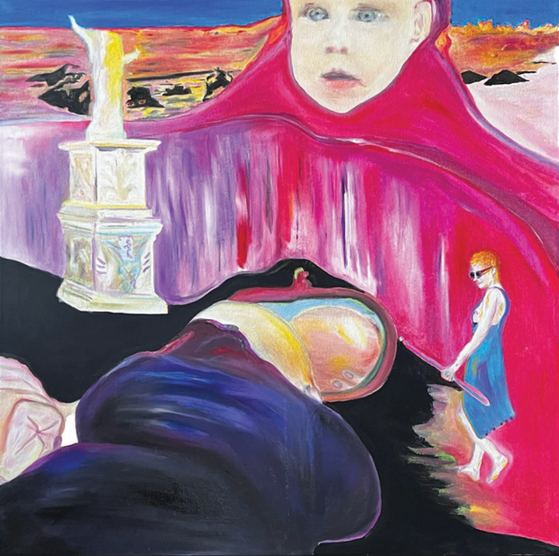 DIKI LUCKERSON LYCHEE FROM A POISONOUS TREE AUGUST 4–SEPTEMBER 1 What does it mean to make a painting that beckons to be licked? A painting that seduces not with its nutritional or intellectual value, but with its toxicity. A painting that contains the ingestible tickets to a psychoactive carnival where every ride runs on maximum overdrive, turbocharged to such a capacity that the flimsy screws holding them in place begin to loosen, bend, and snap, flailing with an unhinged centrifugal vigor that yanks the viewer towards the banks of annihilation. Enter stage left Diki Luckerson, a painter whose hyperchromatic infantilisms piss on the art world’s puritanical pruning, boring holes of repressed baseness into the canvas and planting seeds for some nondescript truth of life to grow in its wildest, most depraved combinations. In her spiritual and artistic practice, Luckerson has embarked on a quest to forage for pits. As a second-level student of Prana Nadi, her hands, joints, and muscles have wired themselves into the interplanar superhighway of energy, empowering her paint with an intuitive dynamism that, rather than burying itself in abstract expressionism’s (“bro shit”) gestural grandeur, feeds on figuration. With the elements as her automatist collaborators (she often paints and stores her unrolled canvases on the roof, rain or shine), she allows smears and subjects to guide her towards a sludge of spontaneous psychical imagery, a rotting and regenerating flesh that congeals around a pit of something forbidden, admissible to the psyche only in these imagistic distortions. Luckerson paints smorgasbords of forms and suggestions where perspective, proportion, and any semblance of planning submits to ripples of destabilizing obliqueness. Decapitated nude bodies covered in slimy eggs, apparitions, teddy bear specters, and screaming children form deformed, off-kilter, stretched, and contorted psyche-scapes that seem fixed in centripetal swirls, simultaneously spewing from and yanked into a gravitational system of self-occluding seeds. A more tangible example is the restless armchair grandmother, warped checkerboard floor, and childlike drawing of either a donkey or Baphomet wearing a Denver-Colorado-forward beanie in “Two Cars,” which all erupted from Luckerson placing her palm into the canvas and outlining her hand; she exchanged this physical silhouette for a spiral of imagery, unraveling itself on the canvas as it surveys and traces the topography of her imagination that, in its irrational spontaneity, orbits the inadmissible. In feasting on a Luckerson, the roles of consumer and consumed flip, and with every bite we take from her acidic scramblings of mental sewage, we are chewed up and spit out reborn. She suggests sites of psychical rifts and sucks us in with an unassuming innocence, stripping us bare to shed light on an internal poisonous tree that reveals itself only when we cannot see it. These works dwarf us not by building an impenetrable barrier of conceptualism or commanding the pious worship of “She who has Superior Technique,” but by feeding us with a hand that bites back, allowing us to suckle on a mind-bending fruit that holds within it the pulse of a beautiful wretchedness.